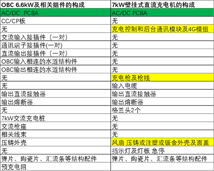 下表是“6.6kW OBC+交流樁”和7kW壁掛式直流充電機的構成對比。僅考慮BOM成本,以相同的采購量來核算,用7kW壁掛式直流充電機,節省的成本主要是7kW交流充電樁。黃色標識部分的成本,值得研究。