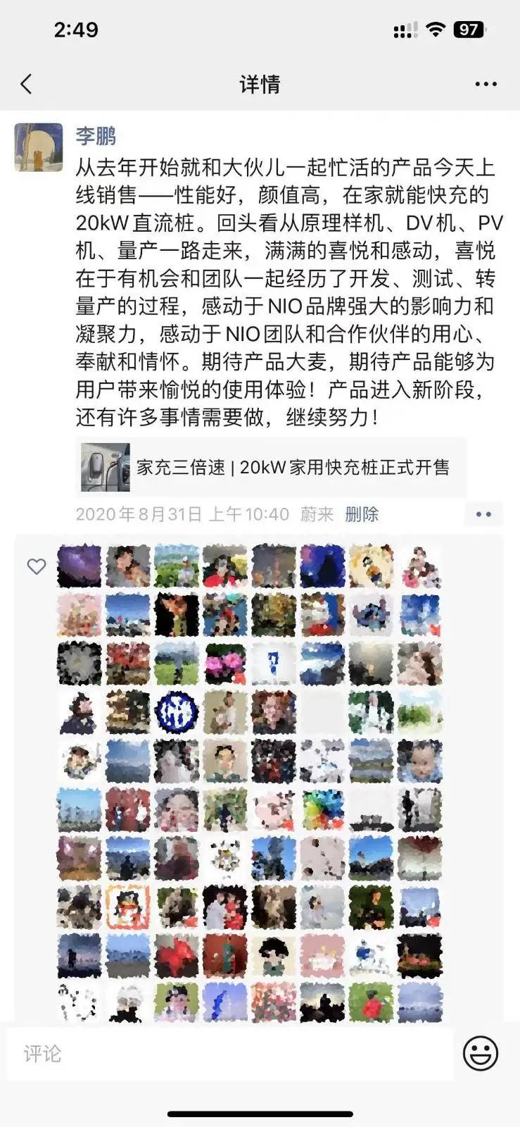 2020年8月31日,蔚來汽車20kW開始發(fā)售,車企同行開始瘋狂跟進(jìn)。一向低調(diào)的李鵬“總理”也高調(diào)地曬出朋友圈。