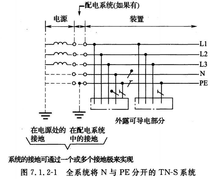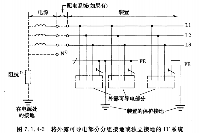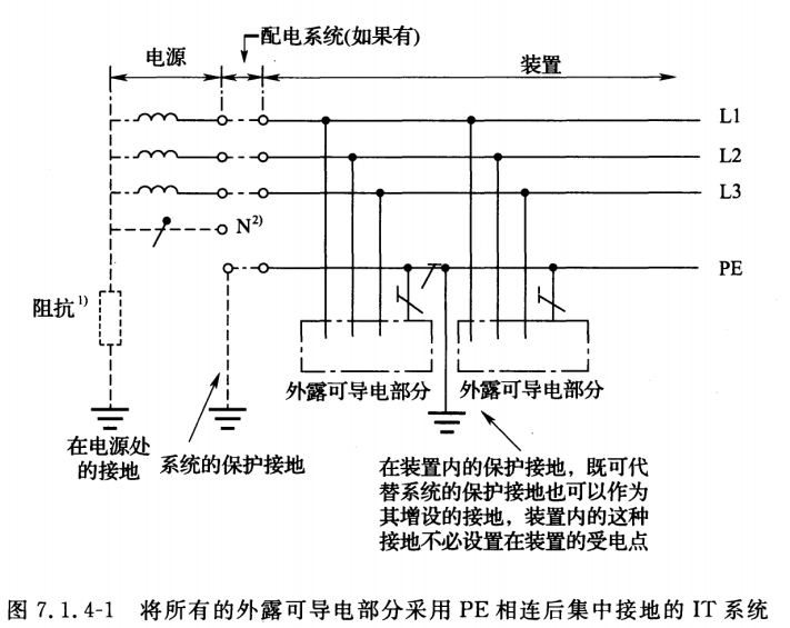 所有帶電部分應與地隔離,或某一點通過阻抗接地。電氣設置的外露可導電部分,應被單獨地或集中地接地,也可接到系統的接地上。對裝置的PE可另外增設接地,并應符合下列要求: