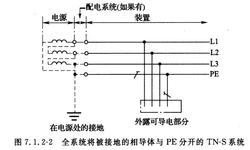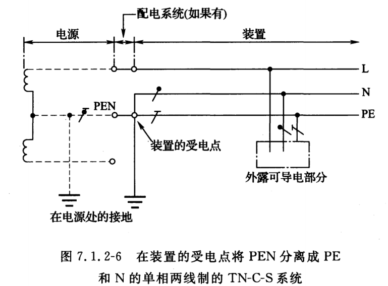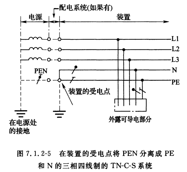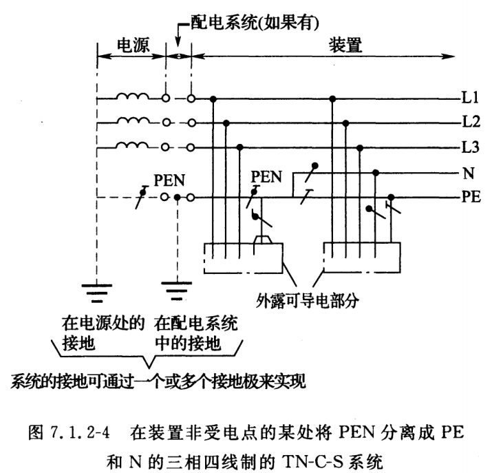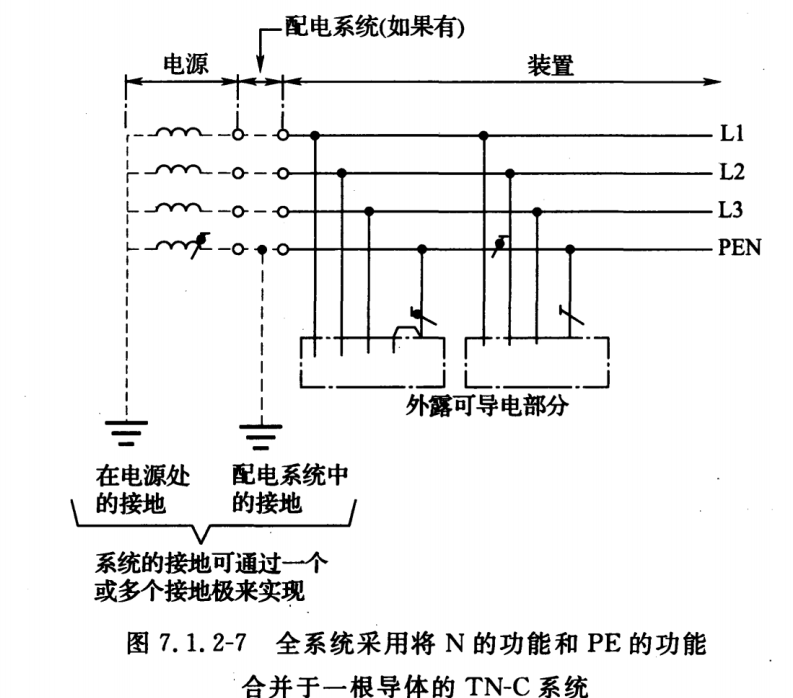 系統中的一部分,N的功能和PE的功能合并在一根導體中。裝置的PEN或PE導體可另外增設接地。配電系統的PEN和裝置的PE導體也可另外增設接地。