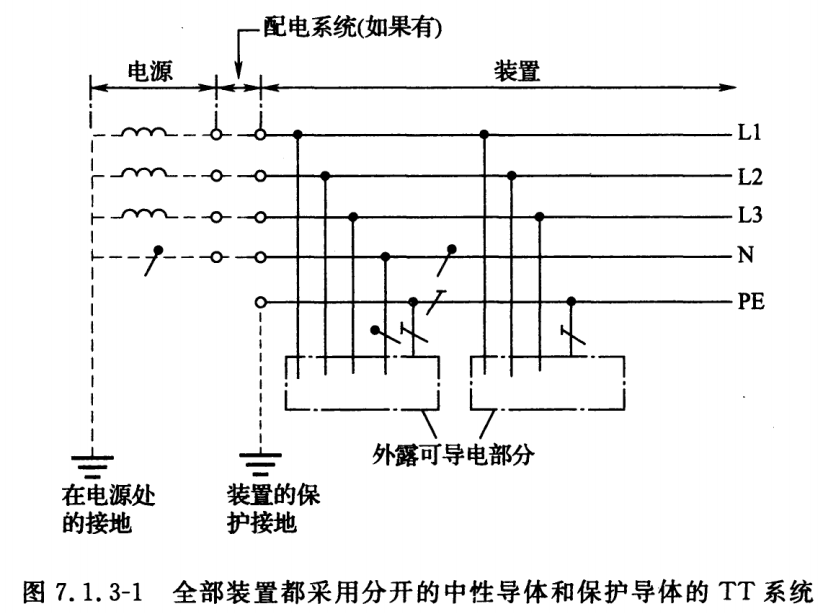 只有一點直接接地,裝置的外露導電部分應連接在電氣上獨立于電源系統接地的接地極上。對裝置的PE可另外增設接地。
