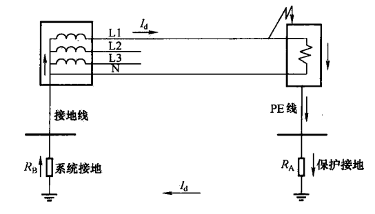 變壓器繞組中性點接地,稱為系統接地(工作接地)。電氣設備外殼接地,稱為保護接地。相線磕碰外殼接地故障時,故障電流Id從PE線到保護接地到系統接地的流向,如圖四所示。