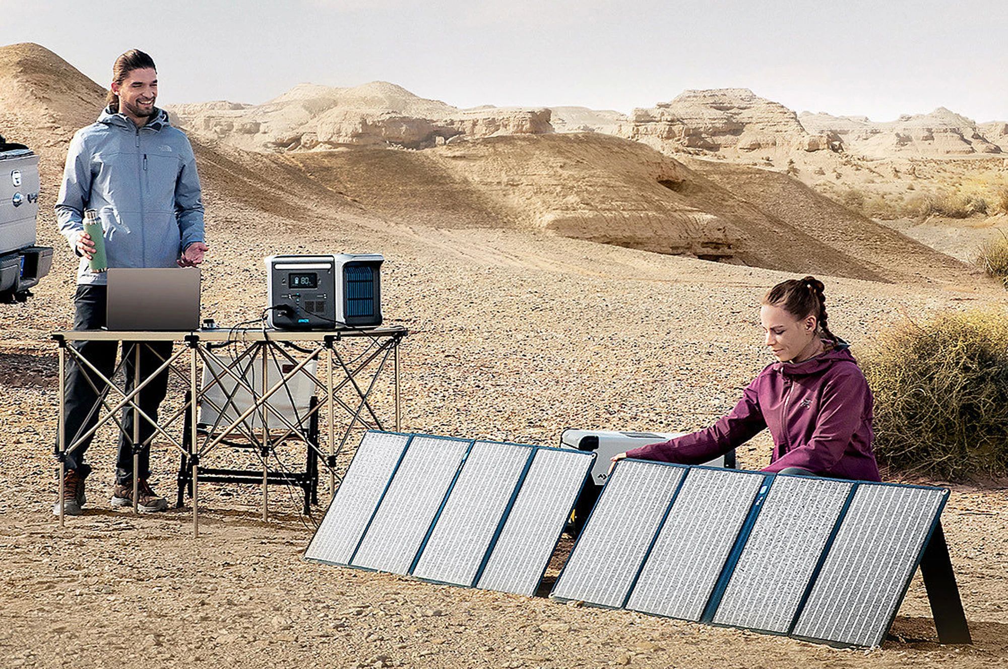 “移動戶外電源”雖然能提供兩度電的大電池,但畢竟容量有限。電動汽車的電池容量相對于“戶外移動電源”的電池容量,則是“超級大”了。拍攝間隙,回到停放在拍攝目的地的停車場,從電車上取電,將“移動戶外電源”補滿電。