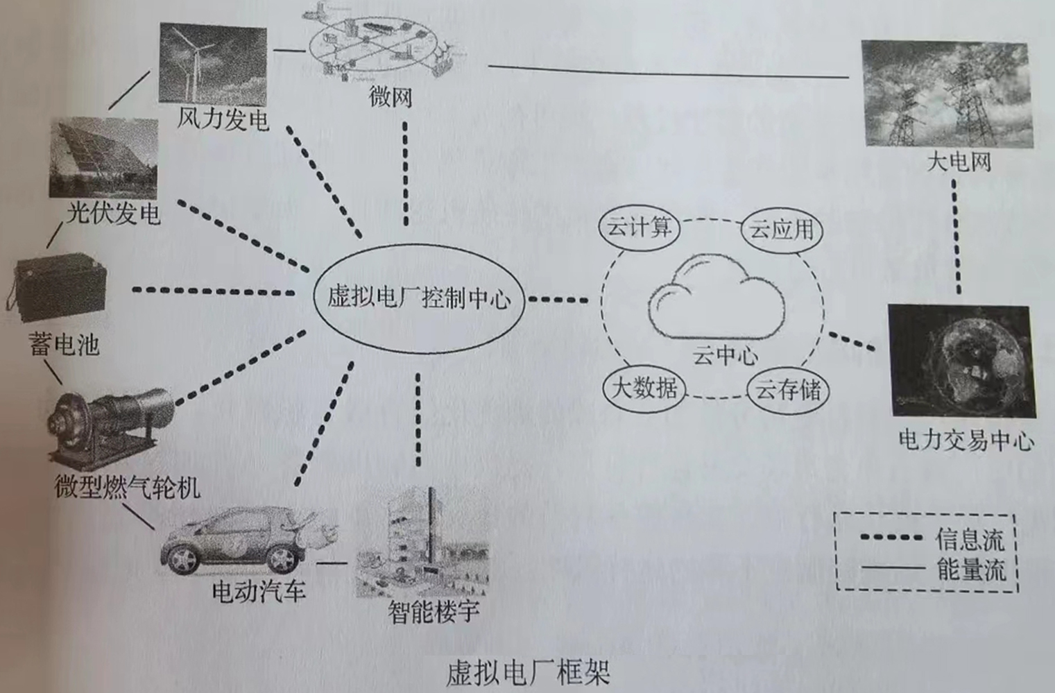 "由可控機組、不可控機組(風、光等分布式能源)、儲能設備、負荷、電動汽車、通信設備等聚合而成,并進一步考慮需求響應、不確定性等要素,通過與控制中心、云中心、電力交易中心等進行信息通信,實現與大電網的能量交互。總而言之,虛擬電廠可以認為是分布式能源的聚合并參與電網運行的一種形式。"