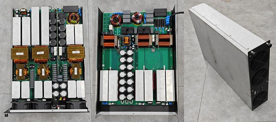 強制風冷的開關電源,講究的是風道的設計,如圖1所示是能效電氣的40kW充電模塊的內部和整體照片。現在的充電模塊多是采用兩個單板對扣的方式,共用80風扇,三個80風扇將大約1600W的熱量帶走。僅靠仿真是無法準確得知每個發熱元器件在不同環境溫度下的溫升。在溫度控制策略確定之前,需要上百個溫度采集探討來測量各種發熱元器件的溫升;但是實際產品中,溫度探頭不可能有這么多。實際產品中可能采用4-8個溫度探頭。根據上百個儀器測量出來的溫度來歸納到幾個溫度探頭的溫度采集結果,抽象出溫度控制算法。