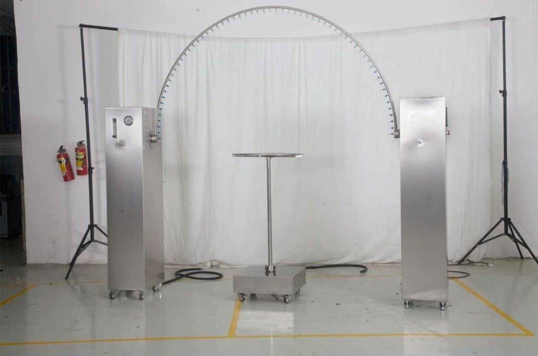 據了解,第三方的IPX4檢測如圖7所示:將待測物放置在圓臺上,頂部的擺管來回搖擺,同時朝下方淋水。