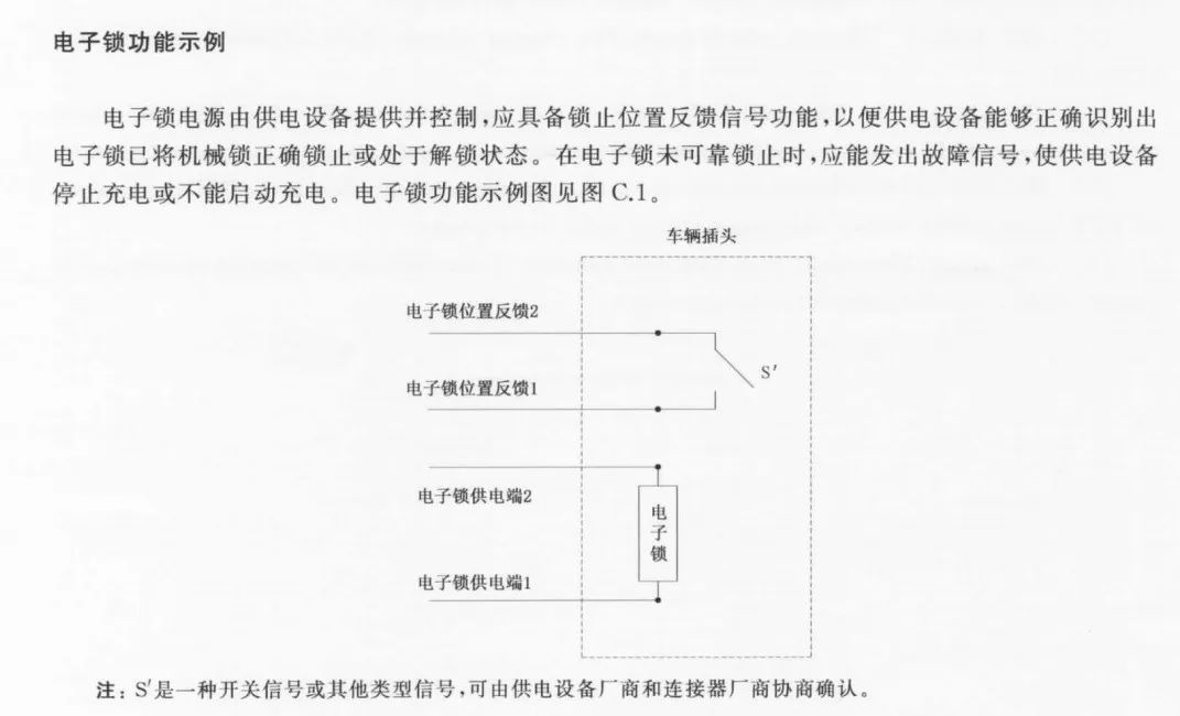 電子鎖的故障率很高。車企朋友們“談槍色變”。充電槍沒有電子鎖,質量都沒問題,一旦有了電子鎖,問題就一堆。而電子鎖的最大問題點之一就是,充電樁控制器接收不到反饋信號,但實際上電子鎖已經鎖止了。微動開關極容易出問題,在電子鎖上這樣,在接觸器上也是。但是,18487.1-2015的附錄C上明確指出(如圖5所示),電子鎖的反饋信號是判斷電子鎖是否鎖止的依據。