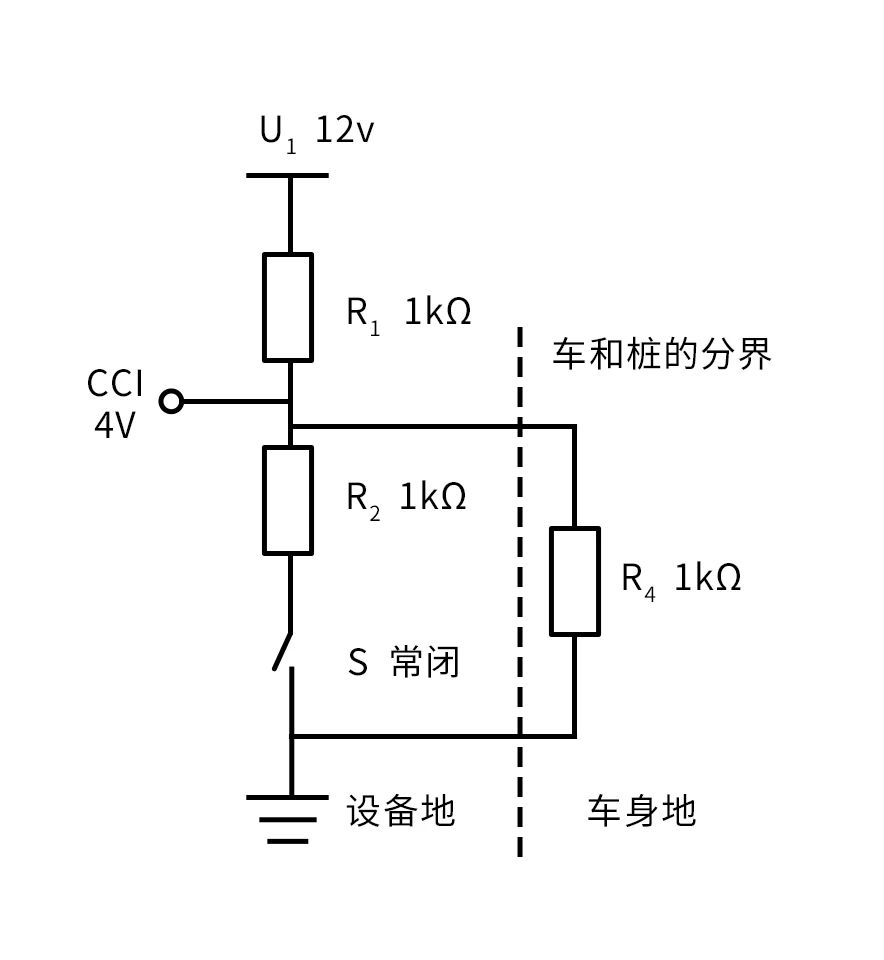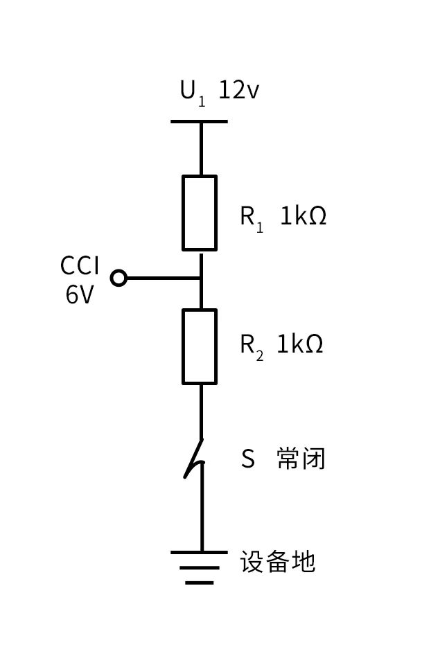 如圖8所示,U1是經過R1和車上的R4、車身地。車身地和設備地連接在一起。S開關是常開狀態。CC檢測點的等效電路的簡化如圖9所示,易算出CC1電平為6V。