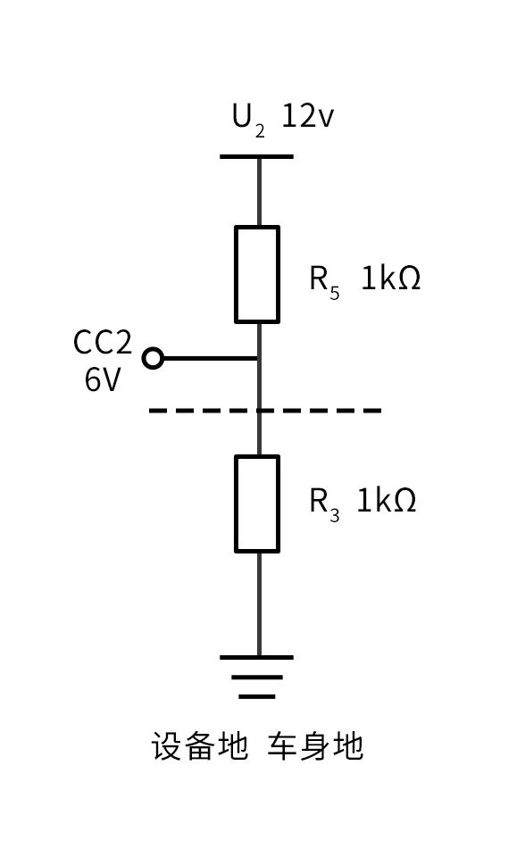 充電槍頭的電阻R3接入車輛,車輛CC2對應的等效電路示意如圖10所示,等效電路簡化如圖11所示。U2 12V連接R5、R3,和車身地、設備地連接在一起。 CC2電平從12V變為6V。