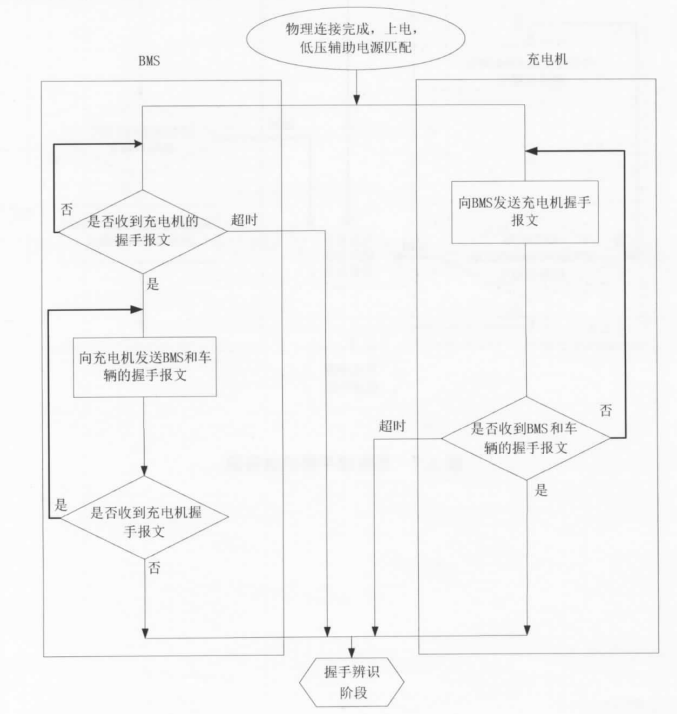 充電樁控制器每隔250ms向BMS發送一次充電握手報文CHM,CHM報文只是包含了通信協議版本號; BMS收到CHM報文后,向充電樁控制器每隔250ms發送一次BMS握手報文BHM,BHM報文只是包含了“最高允許充電總電壓”。27930-2015的標準中給出了詳細的流程框圖,如圖3所示。從時序上看,物理連接完成后,是充電樁控制器先發報文給BMS。如果是預約充電,該充電樁控制器如何獲得使能信號呢?如果是藍牙小程序或后臺預約,就是由樁計時。手機APP/小程序或后臺將設置預約的時刻和將要啟動充電的時刻發給充電樁控制器,控制器累積計時,到了預約啟動時刻,就向BMS發送CHM報文。這里面的計時精度取決于芯片的晶振;如果是車端預約,可能就直接由車端計時。樁和車輛之間的通信采用私有協議。在預約充電時刻,車端BMS給充電樁控制器發出約定的報文,控制器收到約定的報文后,向BMS發送CHM報文。