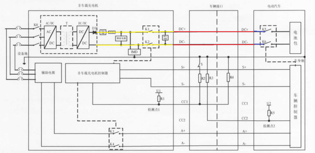 互發握手報文后,進入絕緣檢測階段。關于充電樁的絕緣檢測,我們曾有一篇專文詳解。本文再重新概述一下。充電樁系統的絕緣檢測,在進入充電流程時,是由充電樁完成的; 進入充電流程之后,是由車輛完成的。充電樁所做的絕緣檢測,由充電模塊發出的充電電壓作為電壓源,檢測DC+和DC-母線對PE的阻抗。在做絕緣檢測之前,K1、K2閉合,K5、K6斷開,因此,絕緣檢測的回路包括:1,充電樁內部,從充電模塊的輸出端子到槍線的PG頭的位置,經過了K1、K2。如圖4的黃色標識。2,充電樁外部,從PG頭到充電槍槍頭、插槍座的位置。如圖4的紅色標識。3,車輛內部,從插槍座到K5、K6的外側。如圖4的藍色標識。