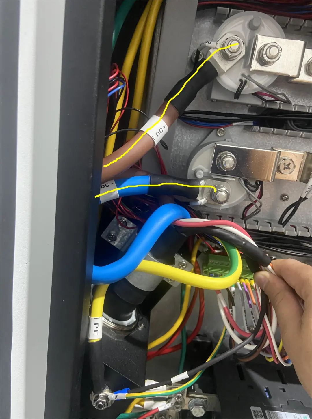 關于充電樁內部和絕緣檢測相關的線路,如圖5黃色標識的是接觸器K1、K2外側到充電樁機殼的PG頭的一端。充電模塊的輸出端子到K1、K2的內側的沒有顯示出來,是很短的一小段電纜。